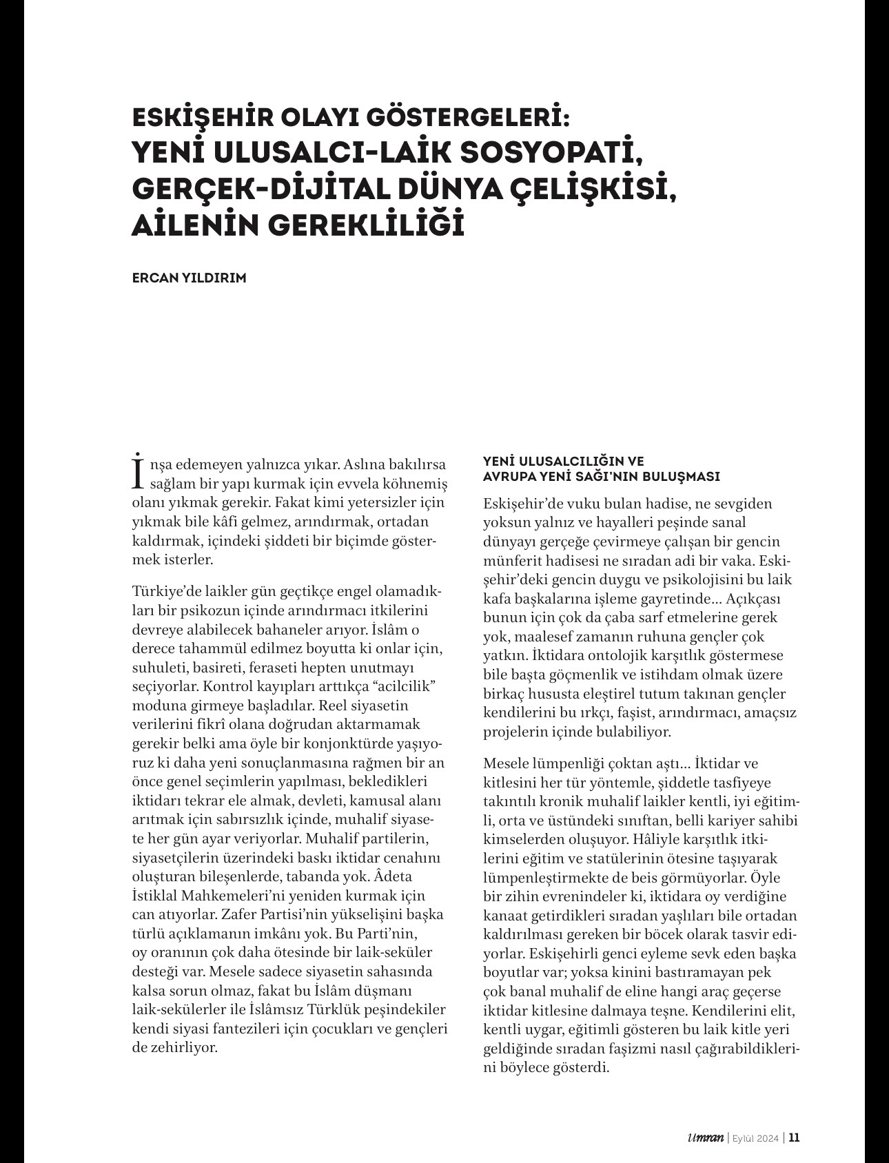 Eskişehir’deki hadisenin magazinel biçimde ele alınmaması emsal teşkilini engeller. Olayın görece erkenden vuku bulması gerekli dersleri ve tedbirleri almak için önemli. Bir taraftan gençlerin dijital tekno-kültüre aşinalığına karşın gerçek hayata yönelik tecbrübî devamsızlıkları ve yetersizlikleri, sanal gerçeklikleri dışarıdaki hayat zannetmeleri ebeveynlerin çocuklarına daha çok özen göstermeleri gerektiğini ortaya koyarken öte taraftan yeni tip ulusalcılığın kitleselleşmemesi için siyasal alanın tedbir alması, politika üretme zorunluluğunu belirliyor.
